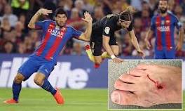 | Filipe Luis Uploads Picture Of Gruesome Injury After Luis Suarez Challenge Lionel Messi's injury against Atletico Madrid last night may have grabbed the headlines but Luis Suarez's challenge on former Chelsea defender ...