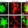 New connection sprouts between Alzheimer's disease and the immune system High-resolution confocal images from the hippocampal CA3 region of Alzheimer's mouse brain show amyloid-beta plaques (green) and microglia/macrophages (red).